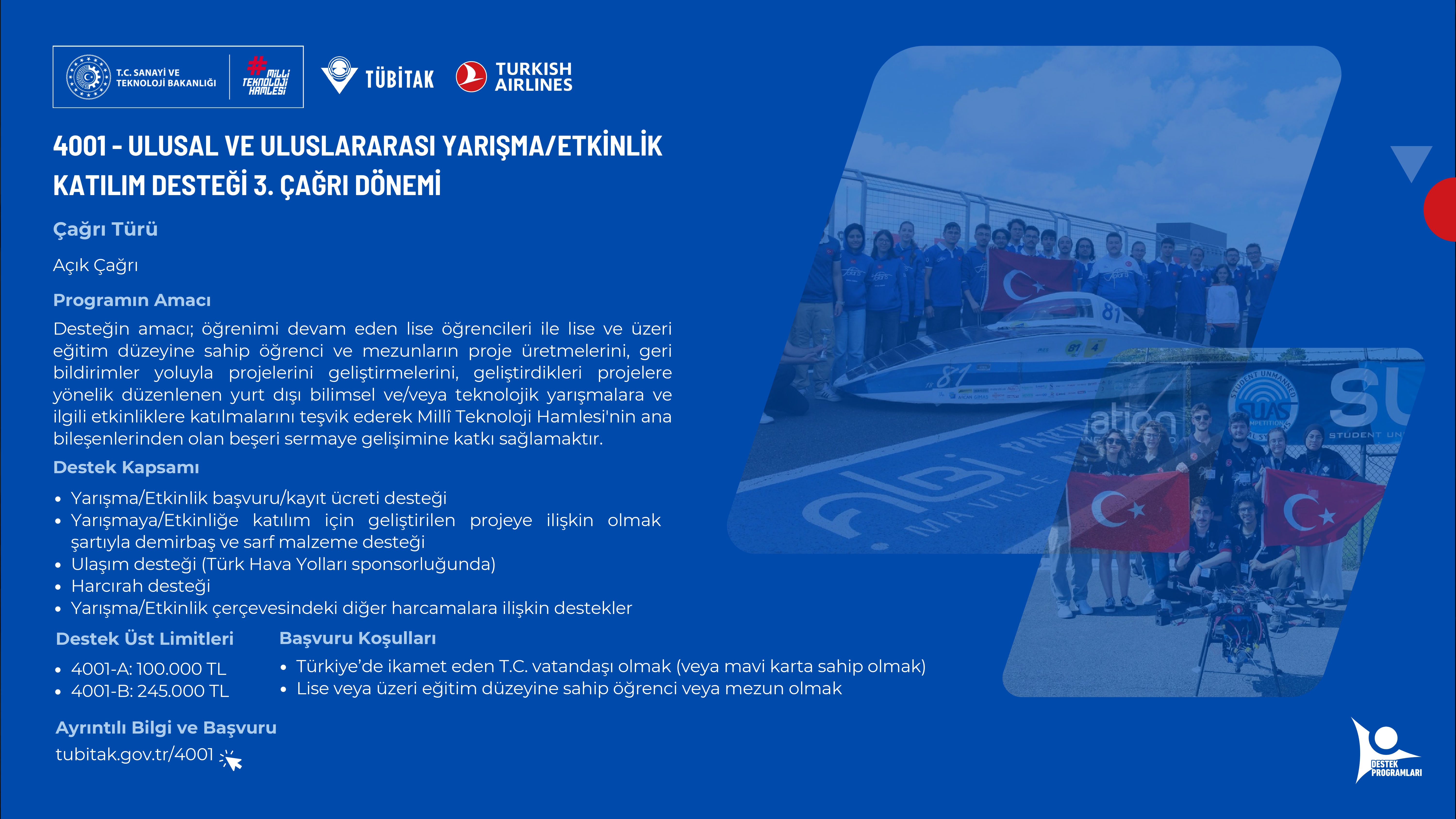 TÜBİTAK Bilim ve Toplum Başkanlığı tarafından yürütülen 4001 – Ulusal ve Uluslararası Yarışma/Etkinlik Katılım Desteği Programı kapsamında, 3. dönem çağrı başvuruları devam etmektedir.
