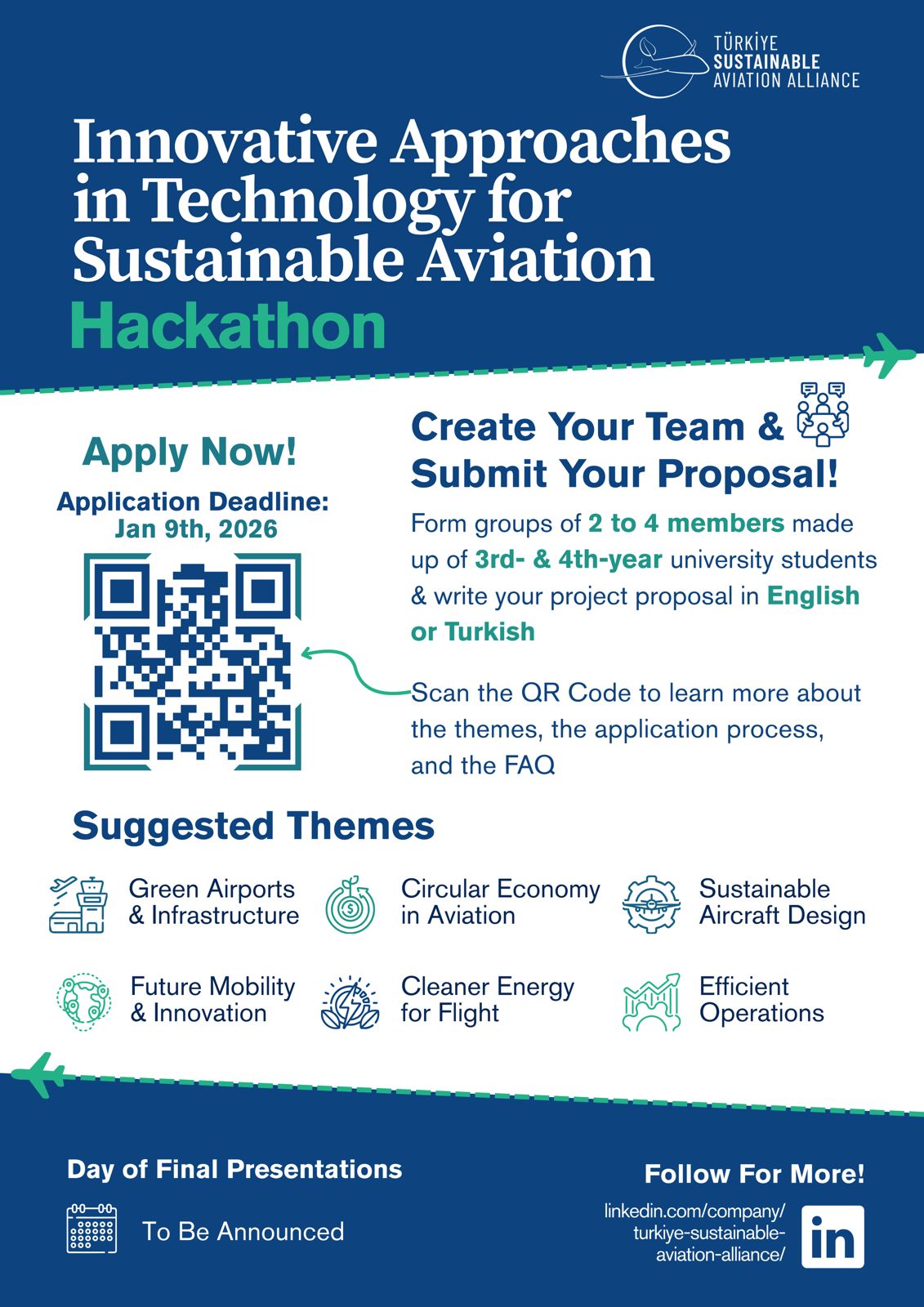 Sürdürülebilir havacılık alanında yenilikçi fikirlerin geliştirilmesini teşvik etmeyi amaçlayan Türkiye Sürdürülebilir Havacılık Platformu - Innovative Approaches in Technology for Sustainable Aviation Hackathon başvuruları başlamıştır.